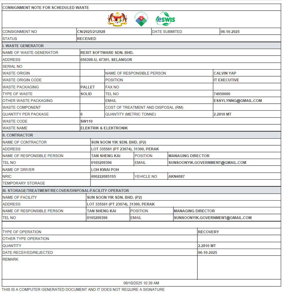 Separately, as part of our effort to responsibly manage electronic and IT‑related waste, we conducted a dedicated disposal exercise for end‑of‑life IT equipment. The scheduled waste was collected and processed by Sun Soon Yik Sdn. Bhd. (P2), a licensed recovery and disposal facility authorized under Malaysian environmental regulations. A total of 2.281 metric tonnes of electronic waste (Waste Code SW110) was transferred for proper treatment under Consignment Note CN/2025/212928, dated 6 October 2025.