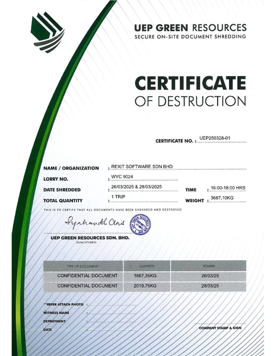 To ensure the proper destruction of confidential documents and office materials, we engaged UEP Green Resources Sdn. Bhd., a certified waste management vendor. A total of 3,687.10 kg of confidential documents were securely shredded and destroyed across two sessions on 26 and 28 March 2025, as documented in Certificate No. UEP250328‑01. This ensures full compliance with data protection requirements and responsible disposal of paper‑based waste.
